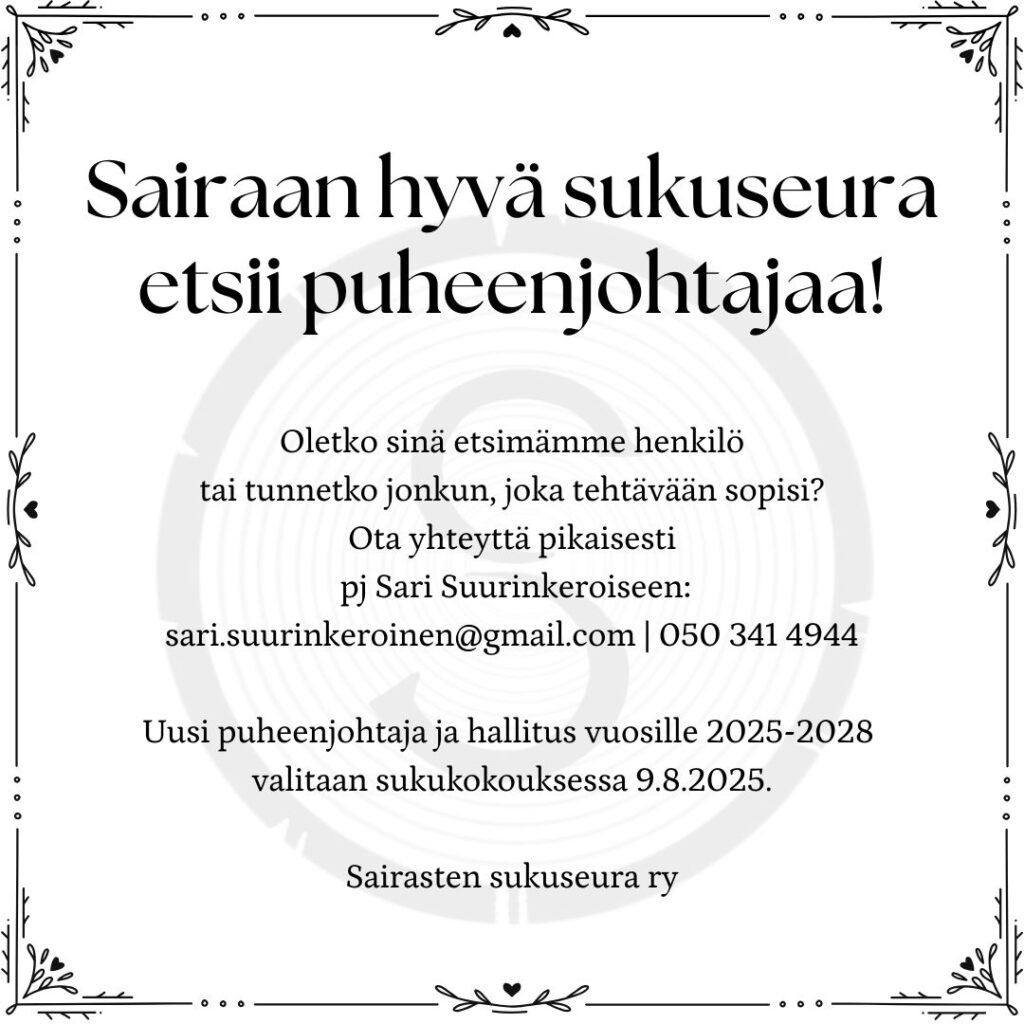 Teollisuusneuvos ja Domus-keittiöiden perustaja Petter Sairanen perusti Sairasten sukuseuran vuonna 1995. Seuran 30 vuoden toimintaan on mahtunut neljä puheenjohtajaa, Mikko Sakari Sairanen, Väinö Sairanen, Mikko Markus Sairanen ja Sari Suurinkeroinen. Heidät palkittiin kokouksessa kukkasin ja seuran uudella T-paidalla, jossa on seuran logo ja teksti ”Sairaan hyvä suku”. Uutuuspaitoja jaettiin tilaisuudessa myös niitä tilanneille.