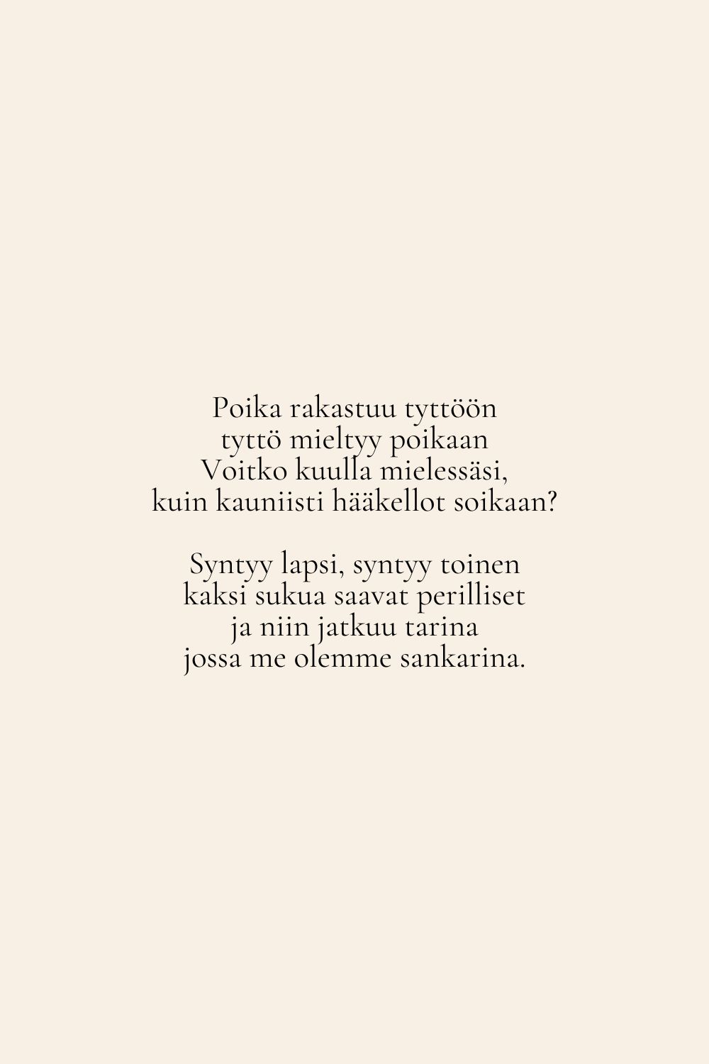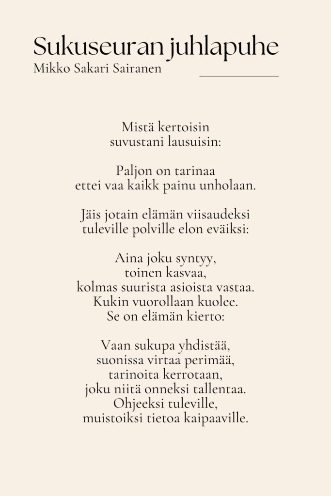 Hyvät kuulijat, tänään olemme yhdessä, tässä hetkessä, kiinni juurissamme ja samalla kasvot kohti tulevaa. Ja jos tekoäly joskus kysyy minulta: ”Mikä on suvun tarkoitus?” Minä vastaan: ”Se on vähän kuin mummon resepti – ei löydy netistä, ei sovi koneen logiikkaan, mutta toimii aina, kun tekee rakkaudella.”