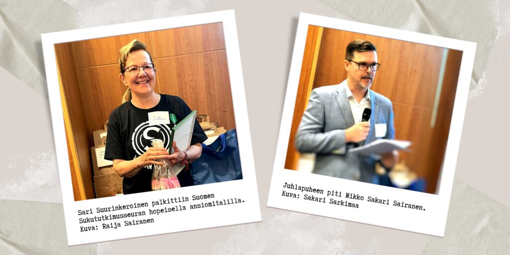 Juhlassa sukuseuran puheenjohtaja Sari Suurinkeroinen – mummi hänkin – sai Suomen Sukututkimusseuran korkeimman huomionosoituksen. Luumäeltä kotoisin oleva, Elimäellä asuva viiden lapsen äiti ja kymmenen lapsenlapsen mummi, lääkäri Sari Suurinkeroinen on toiminut koko 30 vuoden ajan sukuseuran hallituksessa. Hän on ollut eri aikoina sihteeri, rahastonhoitaja, kirjatoimikunnan jäsen sekä puheenjohtaja. Hän aloitti sukututkimuksen jo 1980-luvulla.