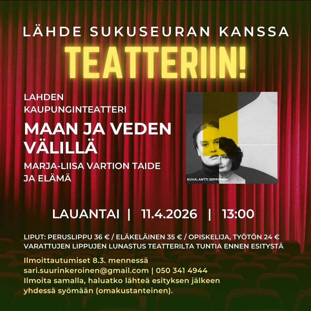 Lähde huhtikuussa sukuseuran kanssa lauantaina 11.4. katsomaan Lahden kaupunginteatterin Marja-Liisa Vartion (os. Sairanen) taiteeseen ja elämään pureutuvaa näytelmää Maan ja veden välillä. Sukuseuralle on varattu esitykseen 15 lippua. Varatut liput on lunastettava teatterilta tuntia ennen esitystä. Esityksen jälkeen voimme jatkaa jutustelua omakustanteisen ruokailun merkeissä.